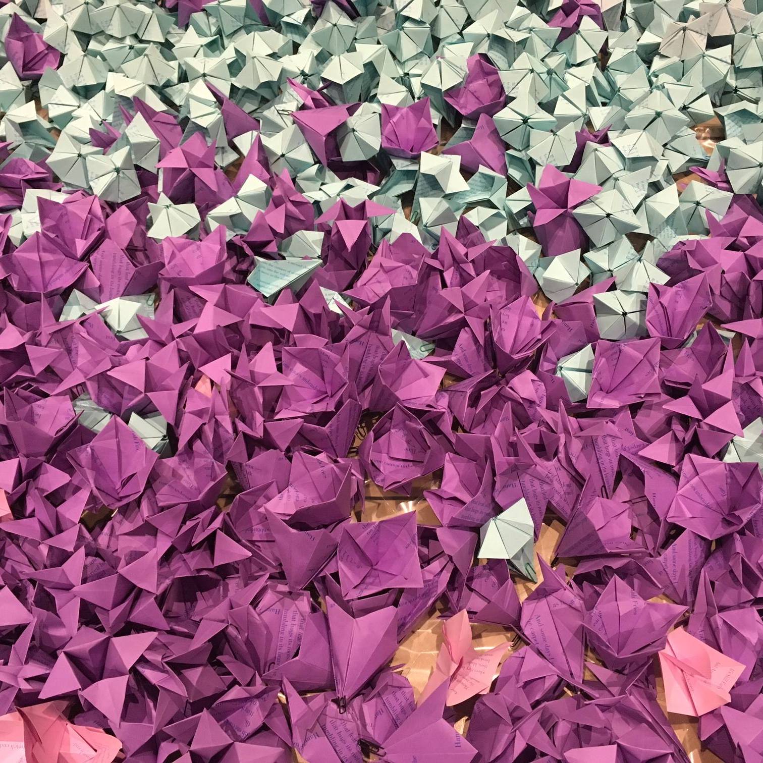 Working with Boston Properties in 2018, I hosted a poetry competition seeking submissions on the theme of spring. After selecting winners, I partnered with Montserrat College of Art to create an installation of origami raindrops and flowers inside The Prudential Center.