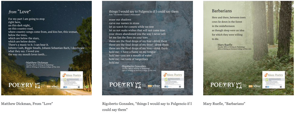 Poetry on the T is a creative placemaking initiative which replaces advertisements on the T with beautifully designed posters featuring work from local poets. I oversaw seven months of placement on all four of the T lines. The series required sponsorship, and I created a media kit to share with potential partners. I partnered with outside organizations including Wellesley College, who showcased poems from faculty, staff, students, and alumni; Penguin Press for the release of a new Mary Oliver collection; and smaller sponsorships from a variety of Mass Poetry partners. Working with OutFront Media, I was ultimately able to feature 46 poetry posters.